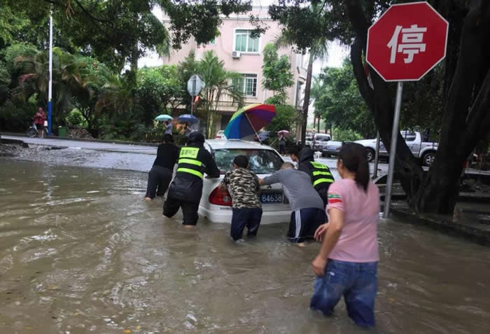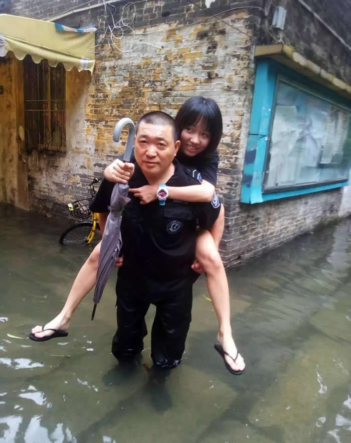 強降雨期間,暴雨夾雜著強風,有的路面積水嚴重,有的車輛被困,有的客戶單位廠房滲水,險情不斷。面對危情,白坭城管特勤隊員二話不說,投身到搶險救災工作中去。有的疏通交通;有的幫助來往熄火車輛推車;有的背著來往市民淌水過路;還有的疏導排水通道。